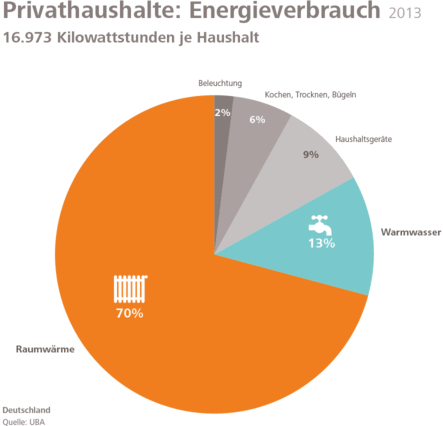 Die meiste Energie, die in einem Haus verbraucht wird entfällt auf die Heizung, obwohl in der öffentlichen Debatte und in den Medien meist nur die Rede von Strom ist. Vergleich man alle Energieverbraucher eines typischen Haushalts anhand der verbrauchten Kilowattstunden, so wird das große Einsparpotential bei der Raumwärme und des Warmwasser-Verbrauchs im Gebäudebestand offensichtlich.