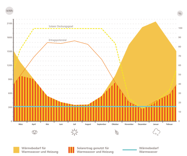 Während der Bedarf an Warmwasser zum Duschen, Waschen und Baden im Jahresverlauf nahezu konstant ist, erhöht sich der Bedarf an Raumwärme in der kälteren Jahreszeit und in den Wintermonaten wenn die Sonne weniger stark und lang scheint. Dennoch lässt sich im Jahresmittel ein hoher Anteil von ca. 30% im Gebäudebestand und rund 50% bei gut-gedämmten Häusern einsparen.