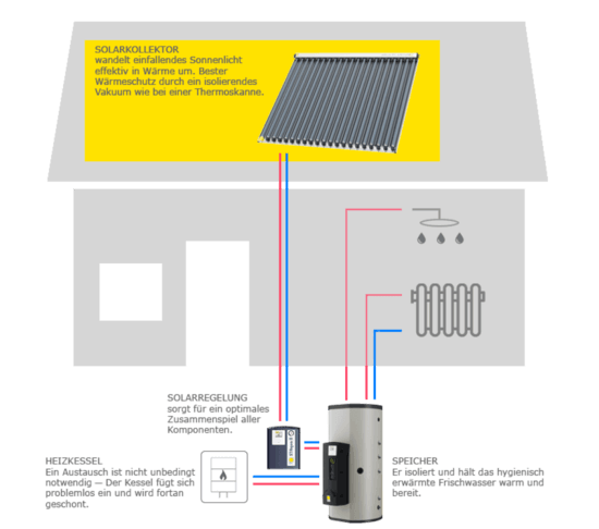 Bei einem Austausch der Heizung hin zu einem modernen Brennwertgerät und parallel Installation einer heizungsunterstützenden Solarwärmeanlage mit Vakuum-Röhrenkollektoren und Pufferzentrale ließen sich die resultierenden Heizkosten bei einigen unserer Kunden halbieren.